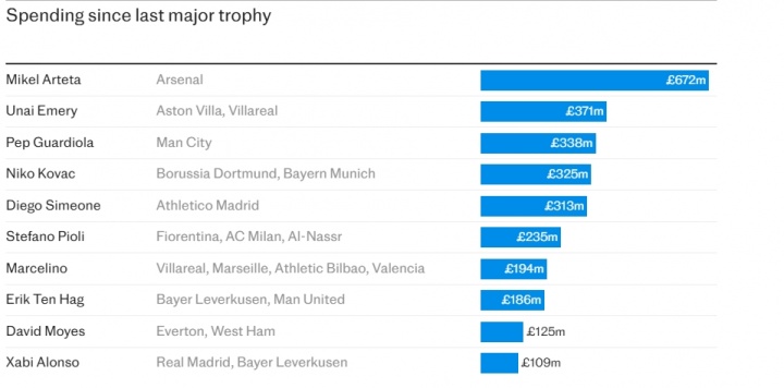 电讯报统计了上一次夺冠之后,各大主帅在引援上的累计花费,阿尔特塔断层第一,埃梅里、瓜迪奥拉、科瓦奇、西蒙尼分列2-5位,滕哈赫排在第8位。